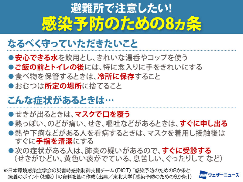 「日本環境感染症学会の災害時感染制御支援チーム(DICT)は、『感染予防のための8ヵ条』を発表しています。
