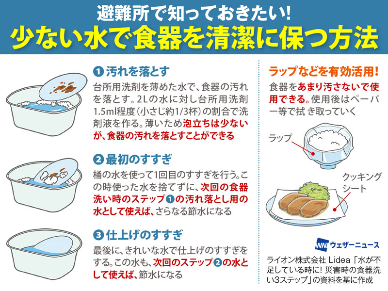使用できる水が少ない場合でも、工夫して食器を清潔に保つことができます。ラップやクッキングシートなどがあれば、食器をあまり汚さずに食事することもできますので、参考にしてください」(山口先生)