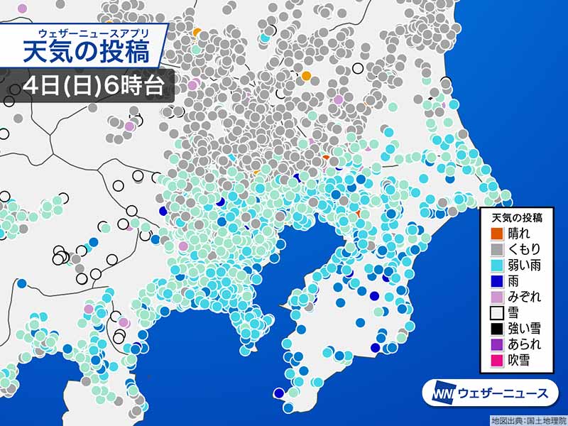 今朝は、東京や千葉など関東南部を中心に傘が必要なくらいの降り方になっています。6時台のウェザーニュースアプリのユーザー投稿を見ると、関東南部を中心に雨になっている状況がわかります。
