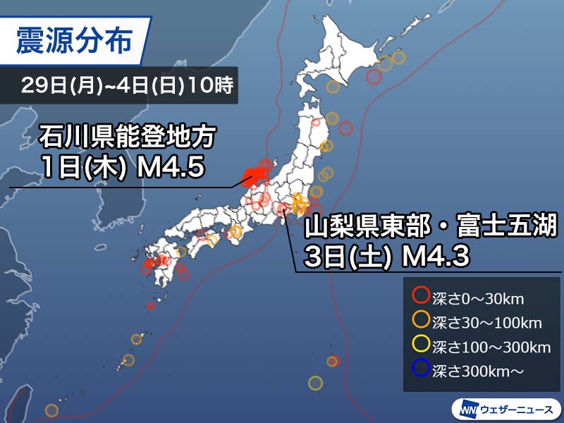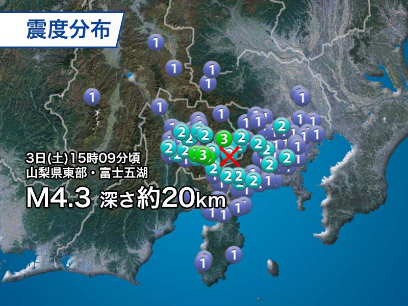 3日(土)15時09分頃、山梨県東部・富士五湖を震源とするマグニチュード4.3、深さ約20kmと推定される地震が発生しました。この地震で山梨県富士吉田市、大月市、富士河口湖町で最大震度3、山梨県甲府市、甲州市、東京都国分寺市、神奈川県横浜市、相模原市、厚木市などで震度2の揺れを観測しています。