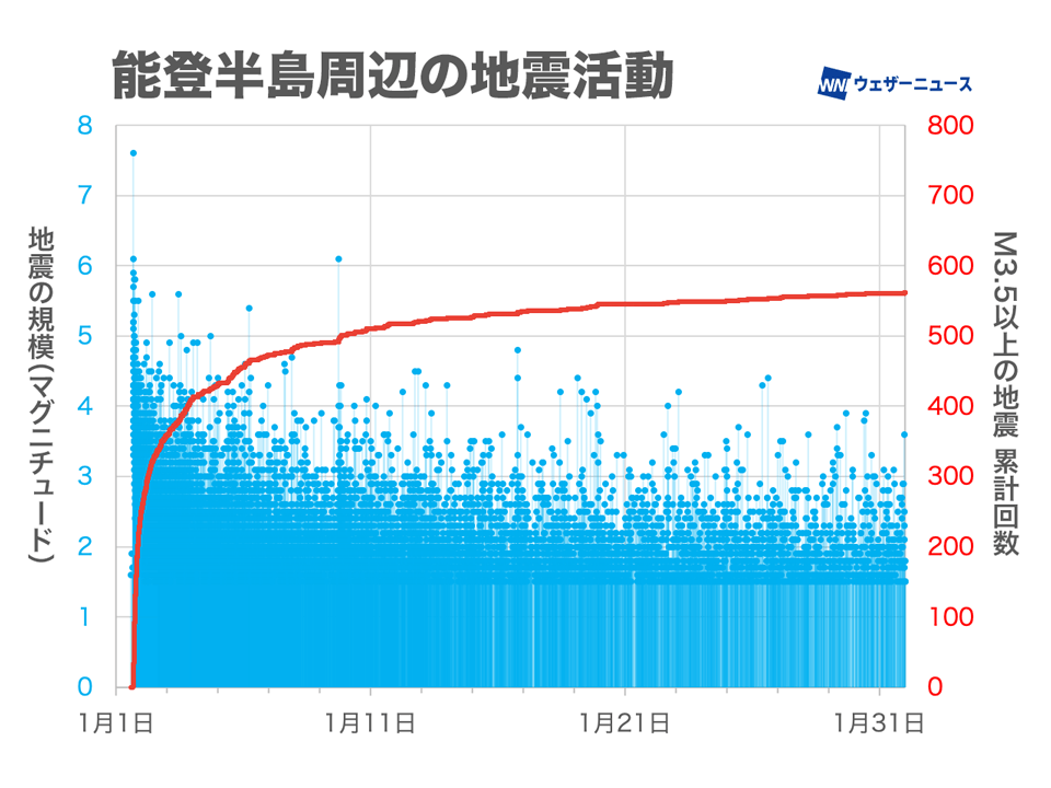 細かい地震も加えた地震の発生状況を見ても、1月下旬以降は顕著な減少傾向が見られずマグニチュード3〜4程度の地震は頻発しています。気象庁は1月29日、震度5弱以上の地震が起きる確率について、通常時の50倍程度になっていると発表しました。