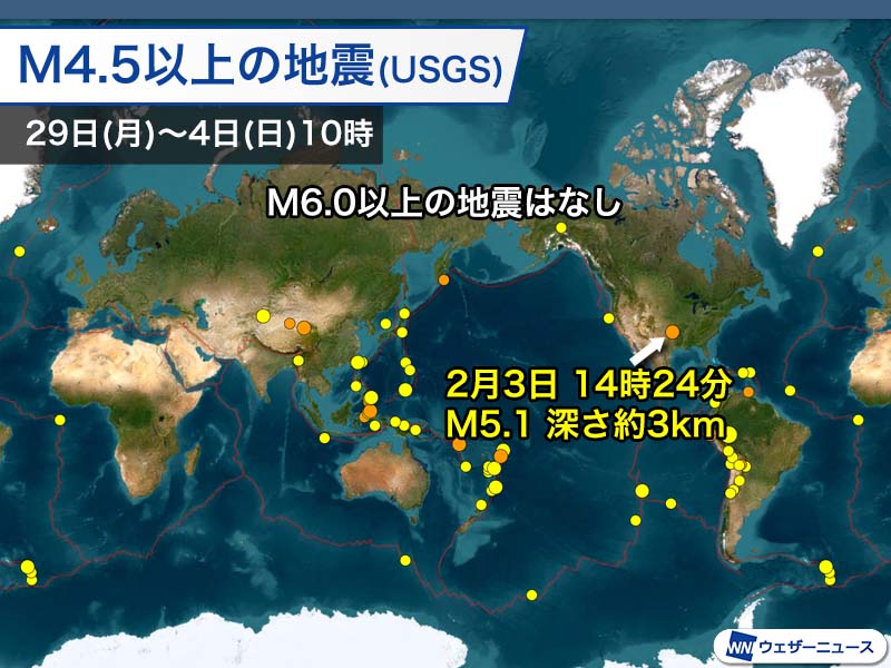 アメリカ地質調査所の解析によるマグニチュード6以上の地震は発生していません。最も大きな規模の地震は南太平洋・トンガ近海で発生したマグニチュード5.8です。