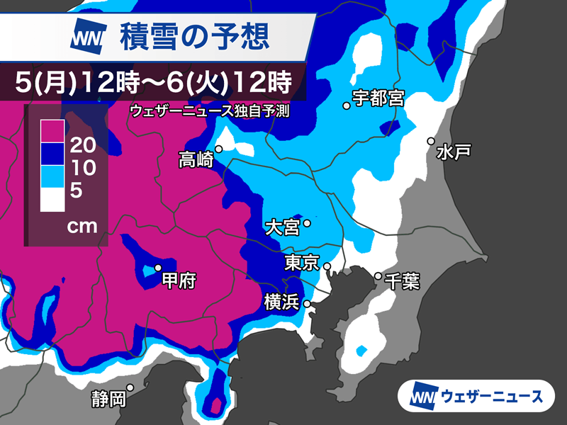 関東甲信の平野部では5日(月)から雪の所が多くなり、東京23区でも5cmを超える積雪となる可能性があります。
