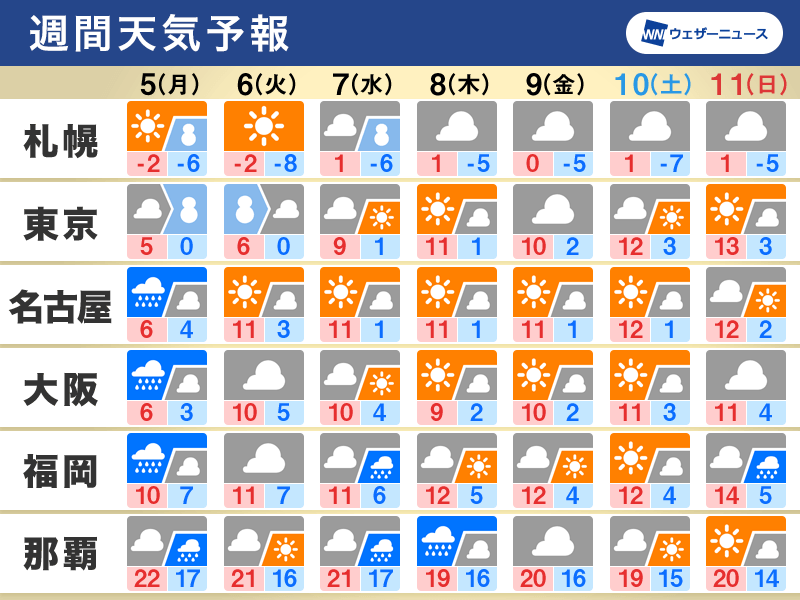関東は6日(火)にかけて雪が降り、積雪や路面凍結による影響に注意が必要です。週後半は太平洋側で日差しが届く日が多くなりそうです。