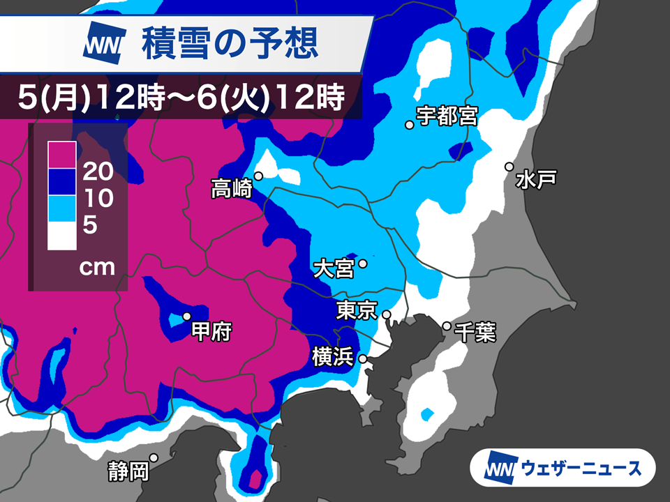 関東では雪や雨が降り出すのは5日(月)の昼すぎとみられ、夕方の帰宅時間帯には内陸部を中心に雪が積もり始める見通しです。低気圧が最も近づいて降水のピークとなる夜に、寒気の南下もピークになるため、急激に積雪が増加するおそれがあります。1時間に3〜5cmの雪が降り、夕方までに雪が積もらなかったとしても状況が一変することもあり得る状況です。