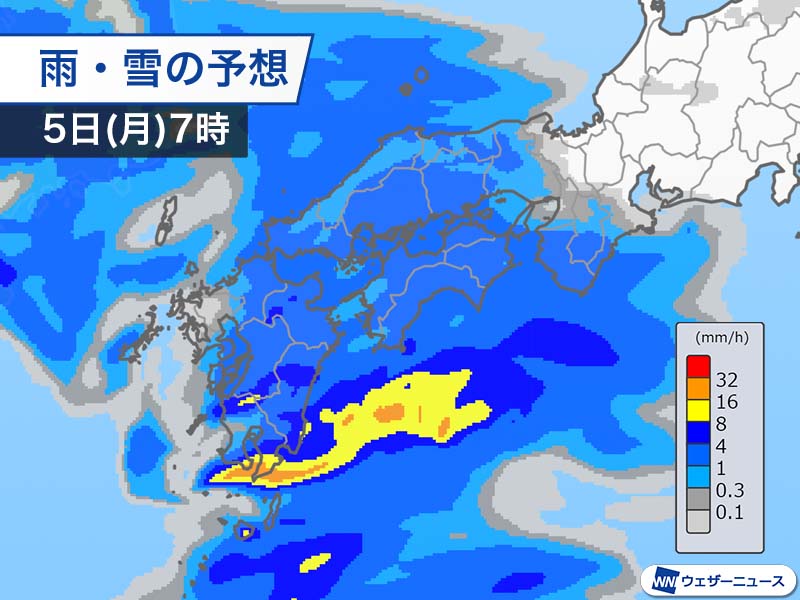 5時00分までの1時間には鹿児島県内之浦で20.0mm、諏訪之瀬島で29.0mmの強い雨を観測しました。これから8時前後にかけて断続的に強い雨が続き、雷や突風を伴う可能性があるため注意をしてください。