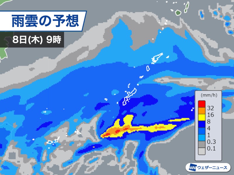 夜遅い時間ほど雨は降りやすくなり、8日(木)には広い範囲で本降りの雨になる見込みです。前線上には低気圧が発生して、朝に八重山地方付近を通過する可能性もあります。先島諸島を中心に、強まる雨や風に注意が必要です。