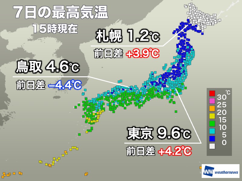 15時までの最高気温の分布を見ると、北日本や日本海側は軒並み10℃を下回っています。上空の寒気の影響で雪や雨が降り、鳥取の最高気温は昨日よりも4.4℃低い4.6℃にとどまりました。ただ、北日本は昨日に比べると気温の上がった所が多く、札幌は3日ぶりにプラスの気温となっています。