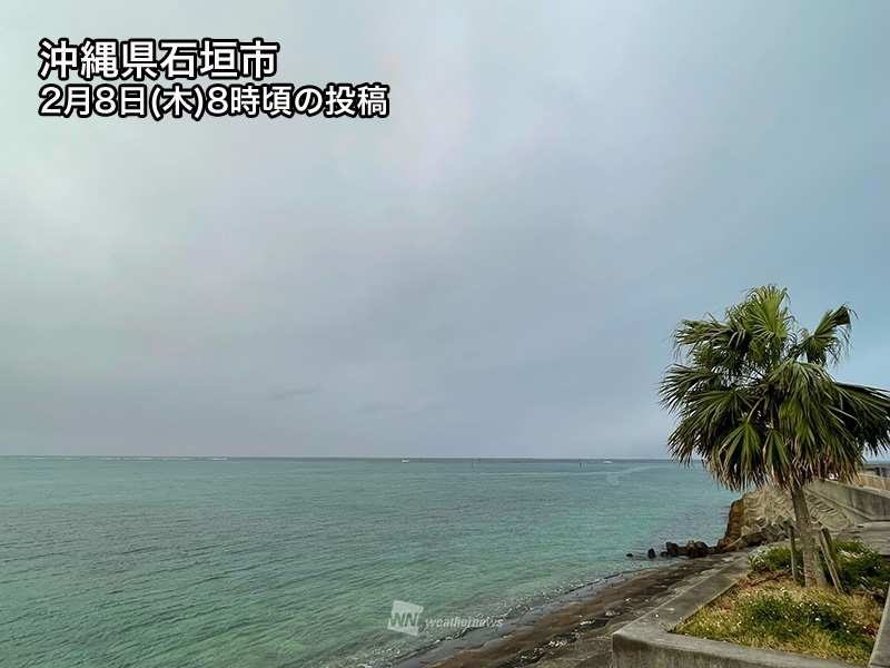 今日8日(木)の沖縄や奄美は朝から雨の降っている所が多くなっています。未明には発達した雨雲が近づき、久米島で1時間に11.5mmを観測するなどやや強い雨が降りました。