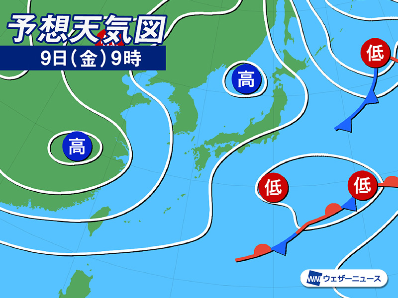 明日9日(金)は弱い冬型の気圧配置になります。日本海側は雲が多く、雪や雨の降る所がある見込みですが、太平洋側の各地は青空が広がります。朝晩は少し冷えますが、昼間は日差しが暖かく感じられそうです。