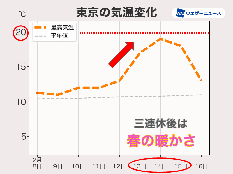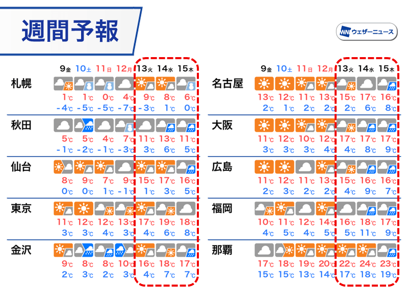 しかし13日(火)から15日(木)にかけては15℃を大きく上回り、20℃近くになることもある予想です。