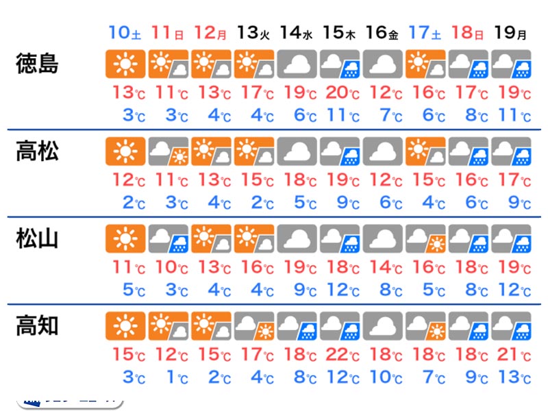 この先1週間の四国の予報を見ると、来週14日(水)〜15日(木)にかけて広い範囲で降水が予想されています。その後も短い周期で低気圧や前線が通過し、周期的に雨が降る見込みです。