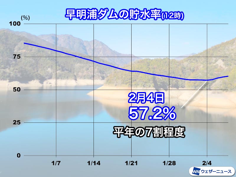 早明浦ダムの貯水率は年明け以降低下を続け、2月4日(日)には57.2%まで低下しました。これは平年に比べると7割程度の少なさです。吉野川水系水利用連絡協議会は貯水量の低下を受けて、8日(木)9時より第一次取水制限を開始しています。