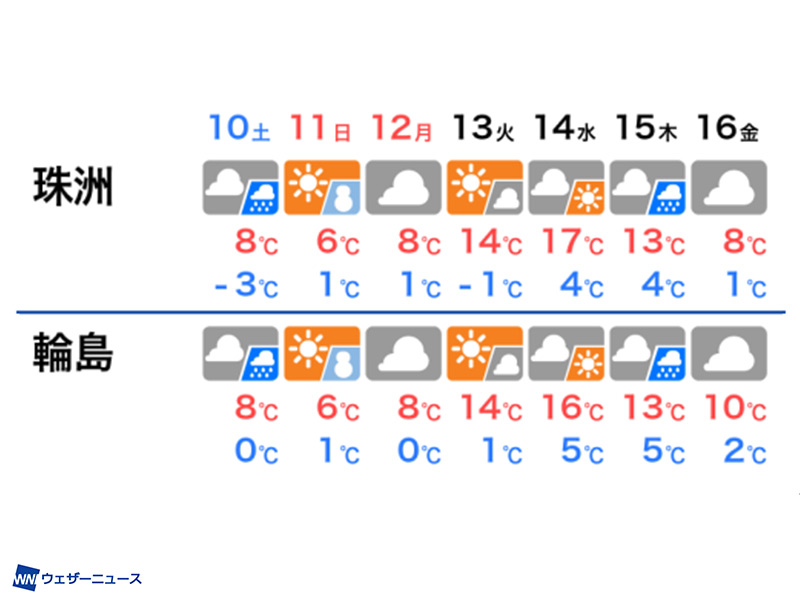 三連休は北日本や日本海側で雪や雨の降る日が多そうです。連休明けは全国的にこの時期としては気温が高くなります。来週後半は広範囲で雨の降る可能性があります。