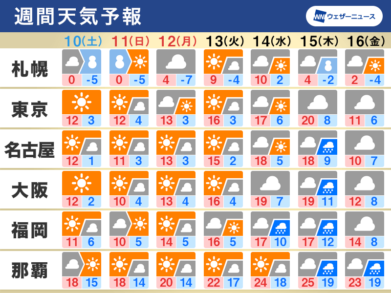 連休明けは南から暖気が流れ込みやすい気圧配置となり、各地でこの時期としては気温が高くなります。特に13日(火)〜15日(木)にかけてが顕著で、本州で20℃前後まで気温が上がる可能性があります。