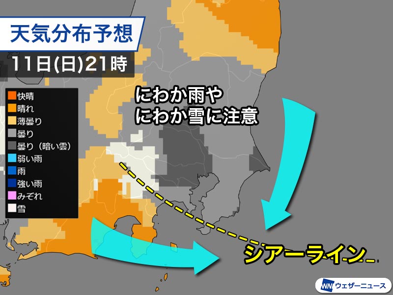 関東は11日(日)の夜からシアーラインの影響が出てきます。西寄りの風と北寄りの風がぶつかり合うことでシアーラインが形成されて、この周辺で雲が発生しやすくなる見込みです。