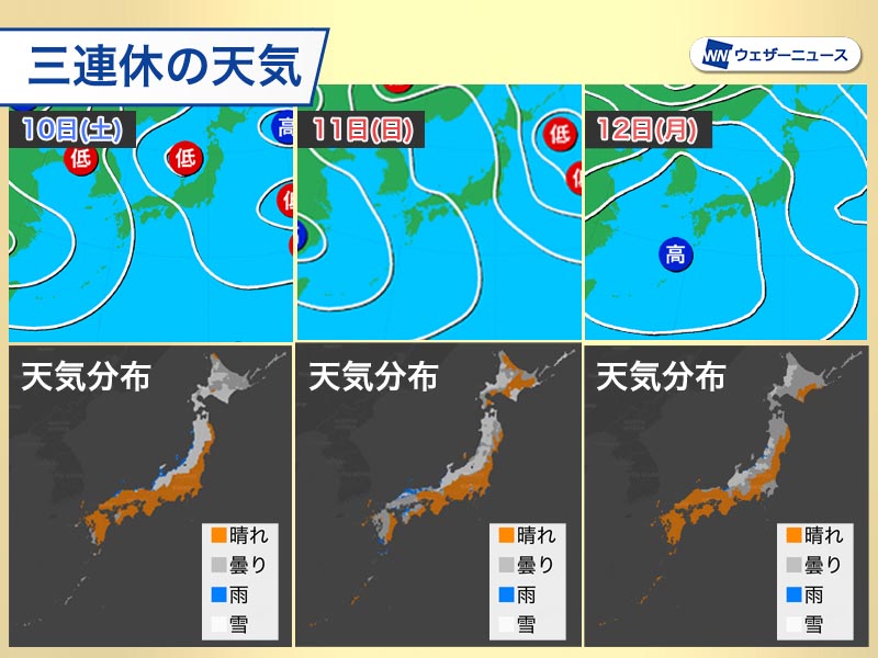 三連休初日の明日10日(土)は低気圧が通過する影響で、日本海側を中心に天気が崩れます。山陰や近畿北部はにわか雨の可能性があり、北陸では雨や雪が一時的に強く降る所がある見込みです。北日本も午後になると雪や雨が降り出し、内陸部を中心に積雪の増加する所があります。太平洋側は晴れる所が多い予想です。