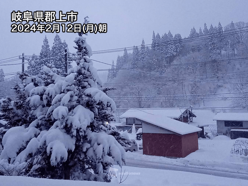 7時までに福井県九頭竜では72cm(昨夜より25cm増加)、岐阜県神岡で39cm(昨夜より19cm増加)、兵庫県兎和野高原で43cm(昨夜より15cm増加)の積雪を観測しています。