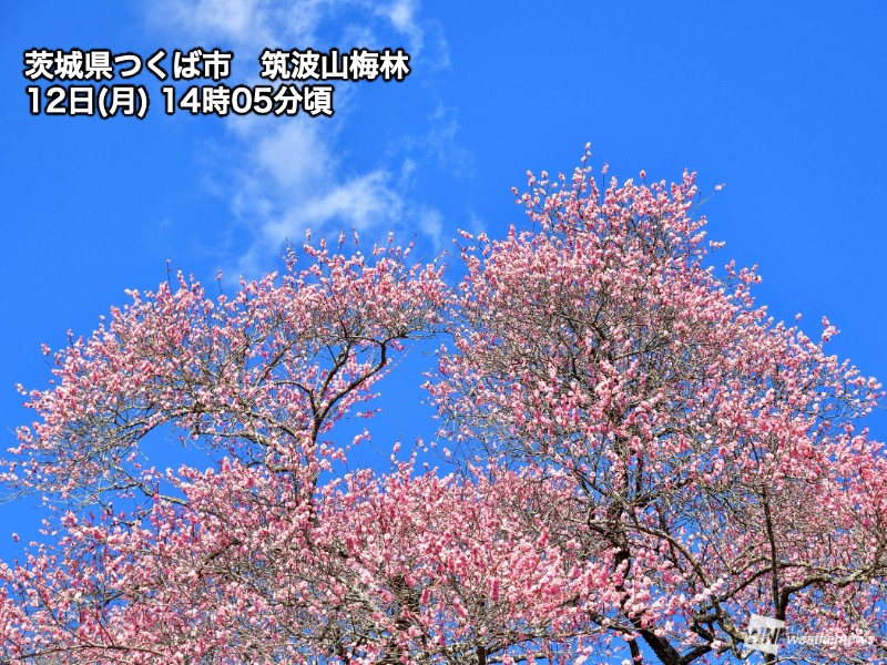 茨城県にある筑波山梅林では紅梅が満開となり、青空とのコントラストが綺麗になっています。筑波山梅林では、今週末17日(土)から「筑波山梅まつり」が開催される予定です。明日13日(火)からは季節先取りの暖かさが続くため、開花はさらに進むとみられます。これから見頃となる白梅も、週末には楽しめる所が増えてきそうです。