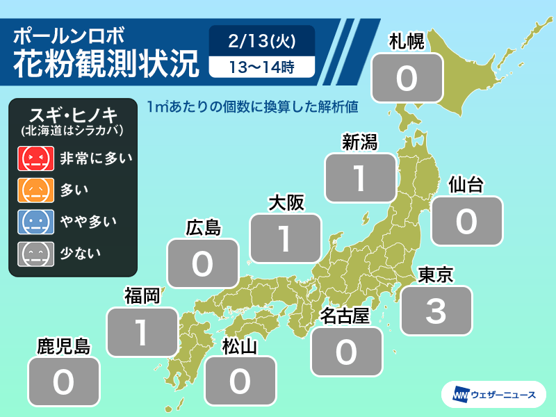 この強風と気温の上昇によって、スギ花粉がやや飛散しているとみられます。ウェザーニュースが独自に設置した花粉観測機「ポールンロボ」による14時までの1時間分の観測状況を見ると、東京は他の地域よりもわずかながら多く観測しました。