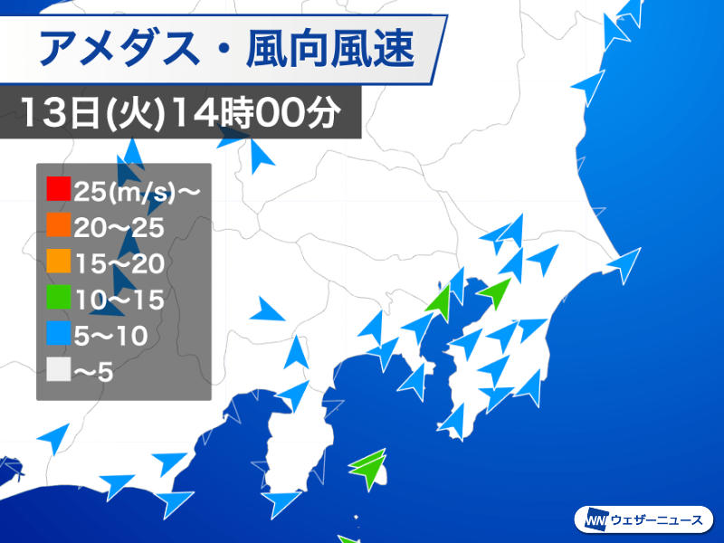 北海道の北を進む低気圧と、本州の南を進む高気圧との間で気圧傾度が大きくなっています。関東南部は沿岸部を中心に朝から南西風が強く、平均風速が10m/sを超えている所もある状況です。千葉県・勝浦では、12時25分に最大瞬間風速20.7m/sを観測しました。