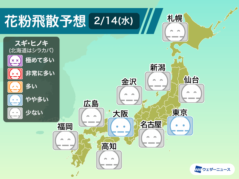 明日も暖かいため、花粉が飛びやすくなる見込みです。東京や大阪では飛散量が「やや多い」予想になっています。花粉症の方は対策を忘れずに行ってください。