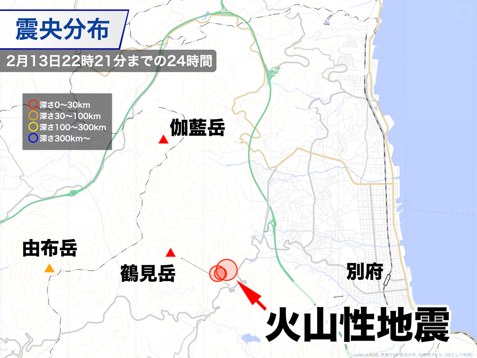 鶴見岳では、今日2月13日(火)の20時52分と21時02分に、山体浅部を震源とする振幅の大きな火山性地震が発生しました。気象庁の速報解析では、震源の深さはごく浅く、地震の規模(マグニチュード)はそれぞれM1.6、M1.2と解析されています。この地震では震度1以上の体に感じる揺れは観測されていません。