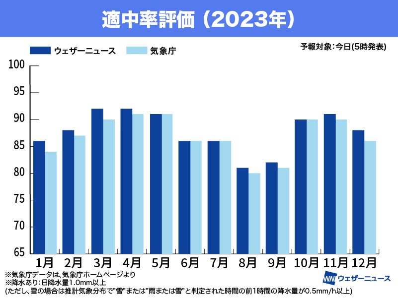 結果を月別に見てみると、すべての月で80%から90%あまりと、気象庁とほぼ同等またはそれ以上となっていました。