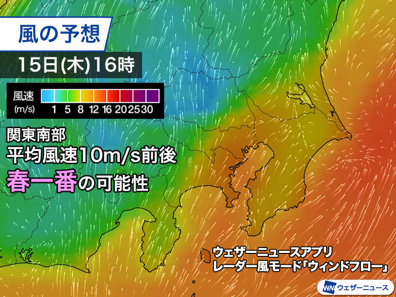 期間や気圧配置は条件を満たすため、東京で平均風速8m/s以上を観測すれば、春一番が発表される可能性が高い状況です。