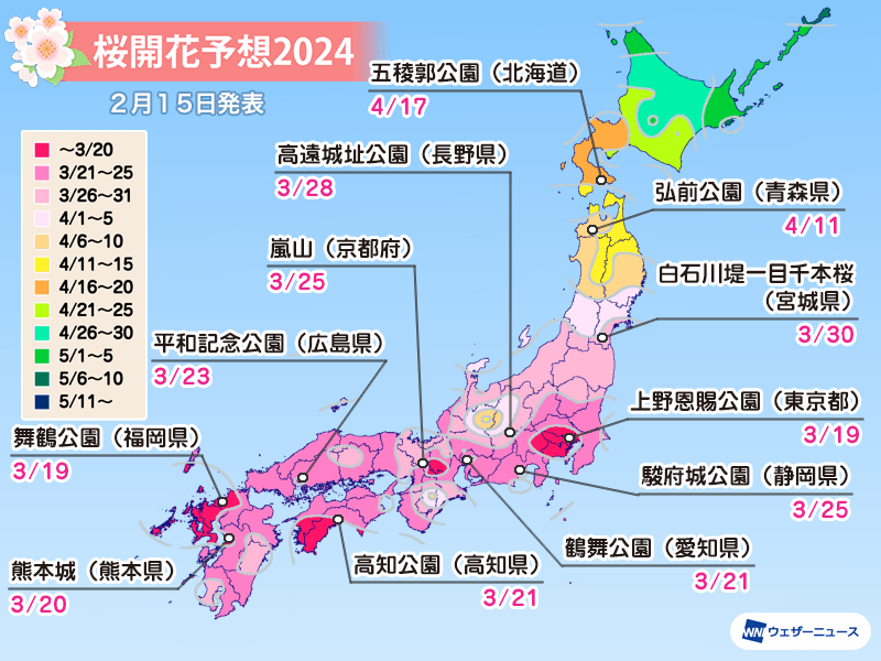 ウェザーニュースでは今日2月15日(木)、2024年の「第三回桜開花予想」を発表しました。ソメイヨシノの開花トップは東京の3月18日の予想で、19日に福岡、20日に長崎、横浜が続きます。2024年の桜の開花は平年より早まるところが多く、西日本や東海では平年並のところがある予想です。