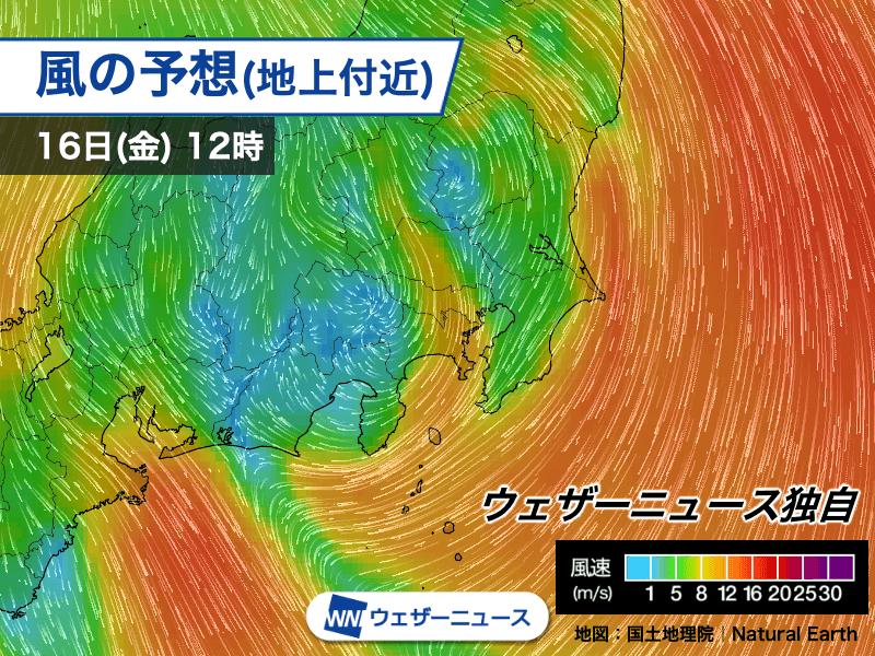 明日16日(金)になると日本付近は一時的に冬型の気圧配置になるため、関東では北風に変わる見込みです。気温はやや下がり、東京都心の最高気温は16℃の予想になっています。
