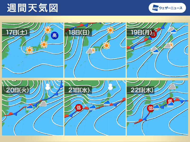 明日16日(金)は冬型の気圧配置になって一旦気温が下がるものの、18日(日)頃からは再び気温が上がる見込みです。特に19日(月)は日本の東に高気圧、日本海に低気圧や前線が進み、上空に暖かな空気が流れ込みやすくなります。