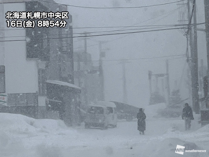 石狩湾では北寄りの風と西寄りの風がぶつかり合うことで「石狩湾収束線」と呼ばれるシアーラインが形成されていて、周辺で雪雲が発達しています。この雪雲が次々に流れ込んでいる札幌市では、9時までの1時間で2cmの雪が降り、日付が変わってから積雪深は8cm増えました。