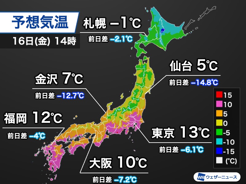 福岡 昨日 16.9℃ 今日 10.9℃(−6.0)