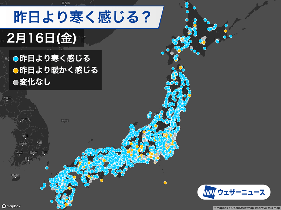 昨日15日(木)は日本海の低気圧に向かって暖かい南風が吹き、春本番の暖かさになっていました。ウェザーニュースのアプリを通して昨日からの体感の変化を調査したところ、11時時点で全国の7割以上の方が、昨日より寒く感じています。