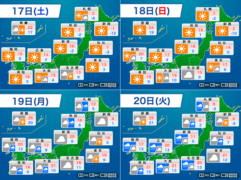 明日17日(土)は移動性の高気圧が北日本を通過します。高気圧は明後日18日(日)にかけて東の海上へ離れるものの、日本付近に勢力を残すため、週末は全国的に晴れる所が多い見込みです。