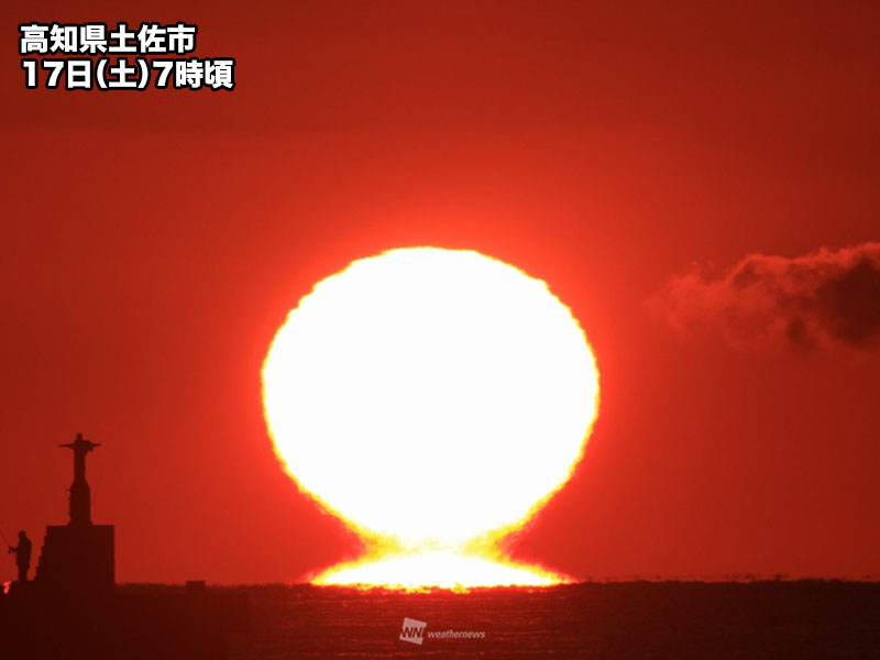 17日(土)朝は晴れて気温が低下したことで、「だるま朝日」の見られたところがありました。海から昇る太陽が水平線間際でくびれたように見える、蜃気楼の一種です。