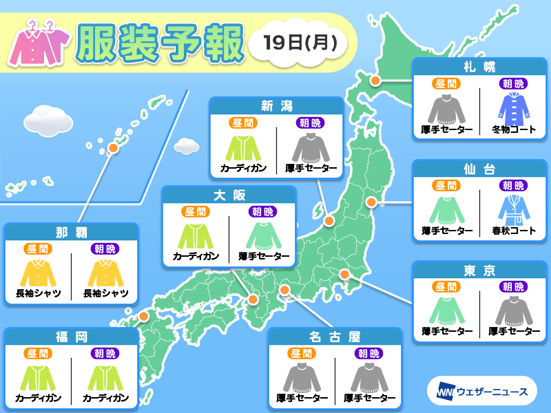 今日と明日の気温変化を比較して、気温に適した服装をご提案します。ウェザーニュースの服装予報もご活用ください。