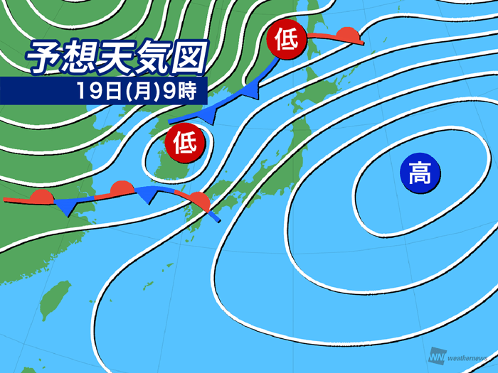 今日19日(月)は低気圧や前線の影響で全国的に天気が崩れます。西日本は朝から雨の降るところが多く、午後は東日本や北日本にも雨の範囲が広がる見込みです。