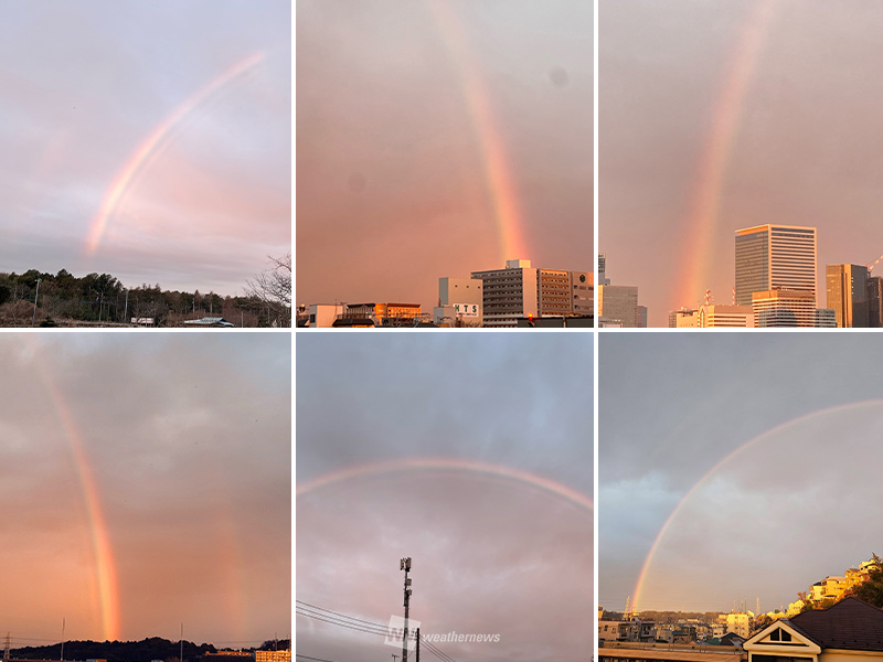 東京や横浜などでは西側にある雨雲に太陽の光が反射して、朝焼けに染まる西の空に大きな虹がかかりました。