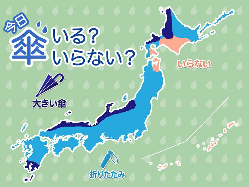 寒気や前線の影響で北陸から山陰にかけては、雨が降ったり止んだりで一時的に降り方が強まることがある見込みです。風も強く横殴りになるので大きい傘が必要です。