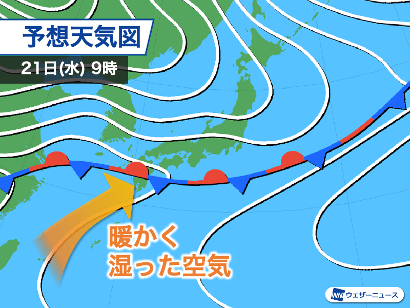 前線は西からゆっくりと北上傾向で、九州では今夜遅くにかけて雨の範囲が広がっていく見込みです。中国や四国でも段々と雨が降り出し、明日の朝には東日本まで雨雲が拡大するとみられます。