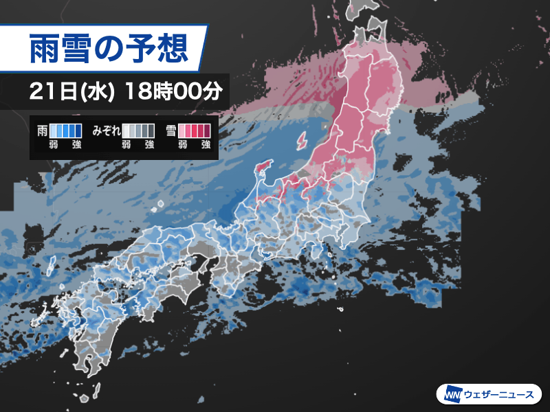 特に明日の夕方以降は降り方が強まり、明後日22日(木)にかけて湿った雪が積もる予想です。仙台など市街地でも、10cm前後の積雪が予想されます。