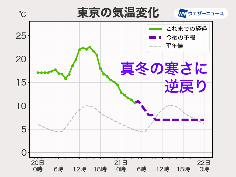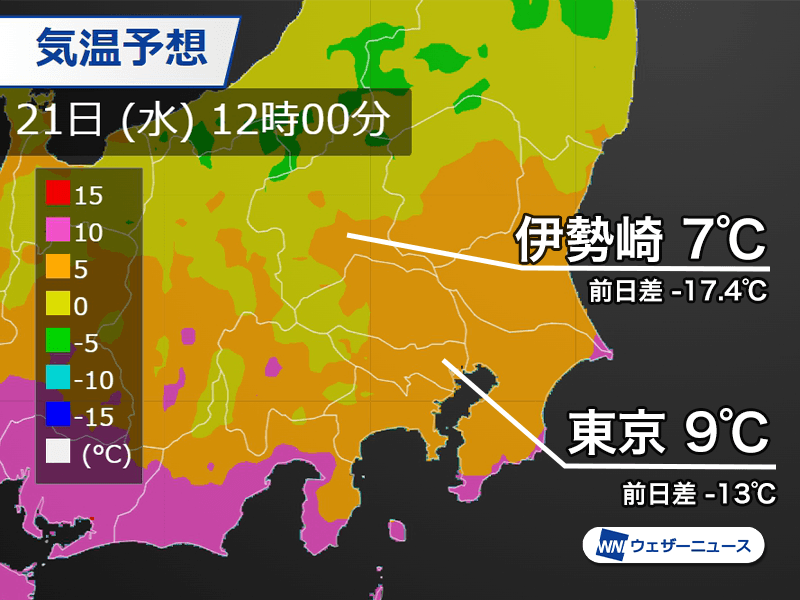 昼間12時の気温は東京とさいたまでで9℃、横浜で8℃、昨日夏日となった伊勢崎市は7℃の予想で、真冬の寒さが戻ります。
