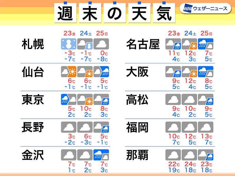 真冬の寒さに逆戻りし、今週前半との寒暖差が非常に大きくなるため、気温の急激な変化で体調を崩さないように服装にも注意してお過ごしください。