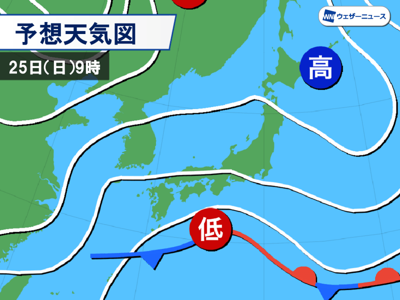 連休最終日の25日(日)になると前線は北上傾向となり低気圧が西から進んでくる予想です。