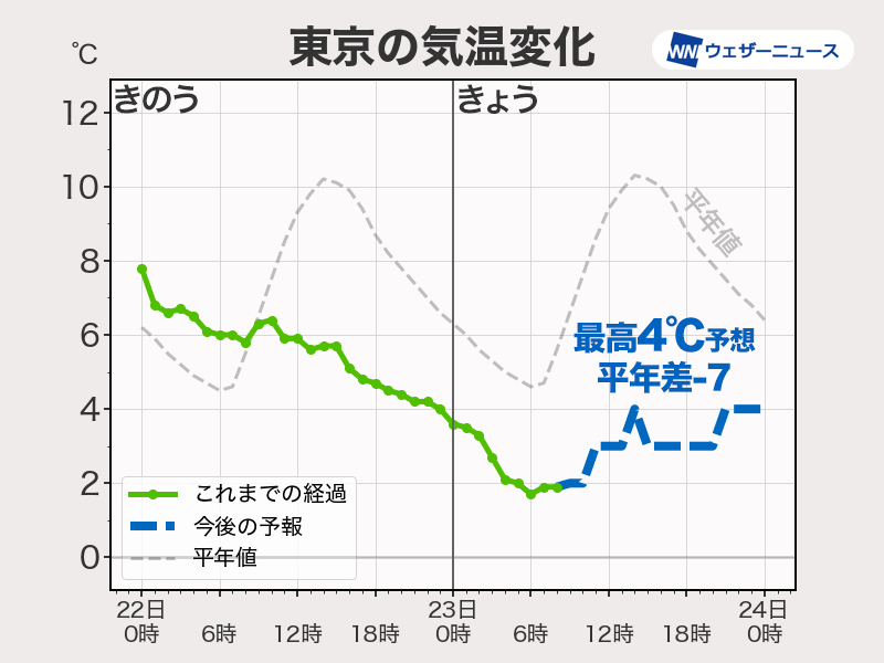 東京 4℃(−7)最も寒い時期を下回る