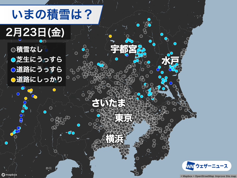 ウェザーニュースアプリ利用者に今の積雪状況を聞いた所、茨城県では北部の水戸市周辺だけでなく、南部からも「芝生にうっすら」の回答が届き、栃木県も宇都宮市周辺で「芝生にうっすら」の回答がみられます。