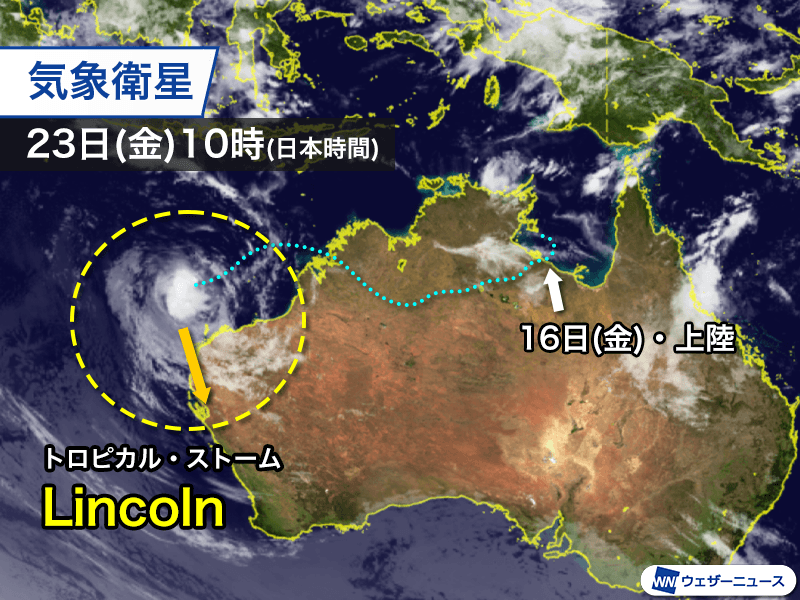 15日(木)に発生した熱帯低気圧が勢力を強め、トロピカル・ストームLincolnとなってオーストラリア北部に上陸しました。上陸後は勢力を落として熱帯低気圧となり、しばらくはオーストラリアの北部を西に進んで、21日(水)にはインド洋に抜けています。