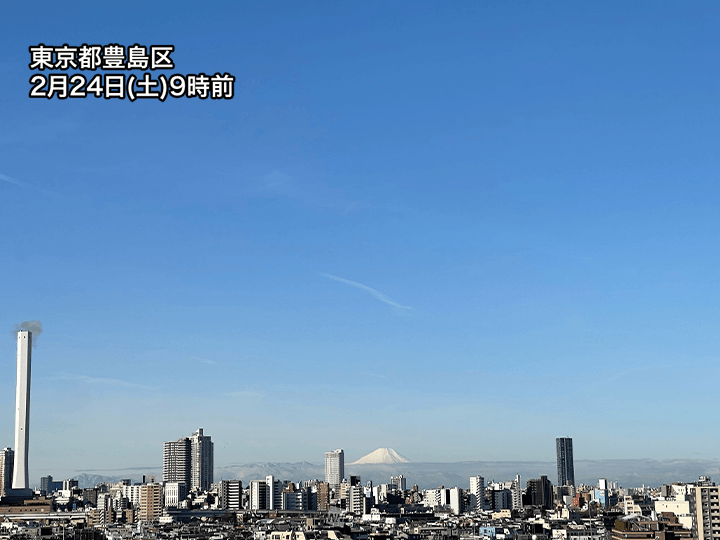気象庁では雲量(空の全天に占める雲の割合)が0〜1の場合、快晴と定義しています。東京の天気が快晴となるのは18日(日)21時以来6日ぶりです。視界も非常に良く、23区からも富士山の姿がみられました。